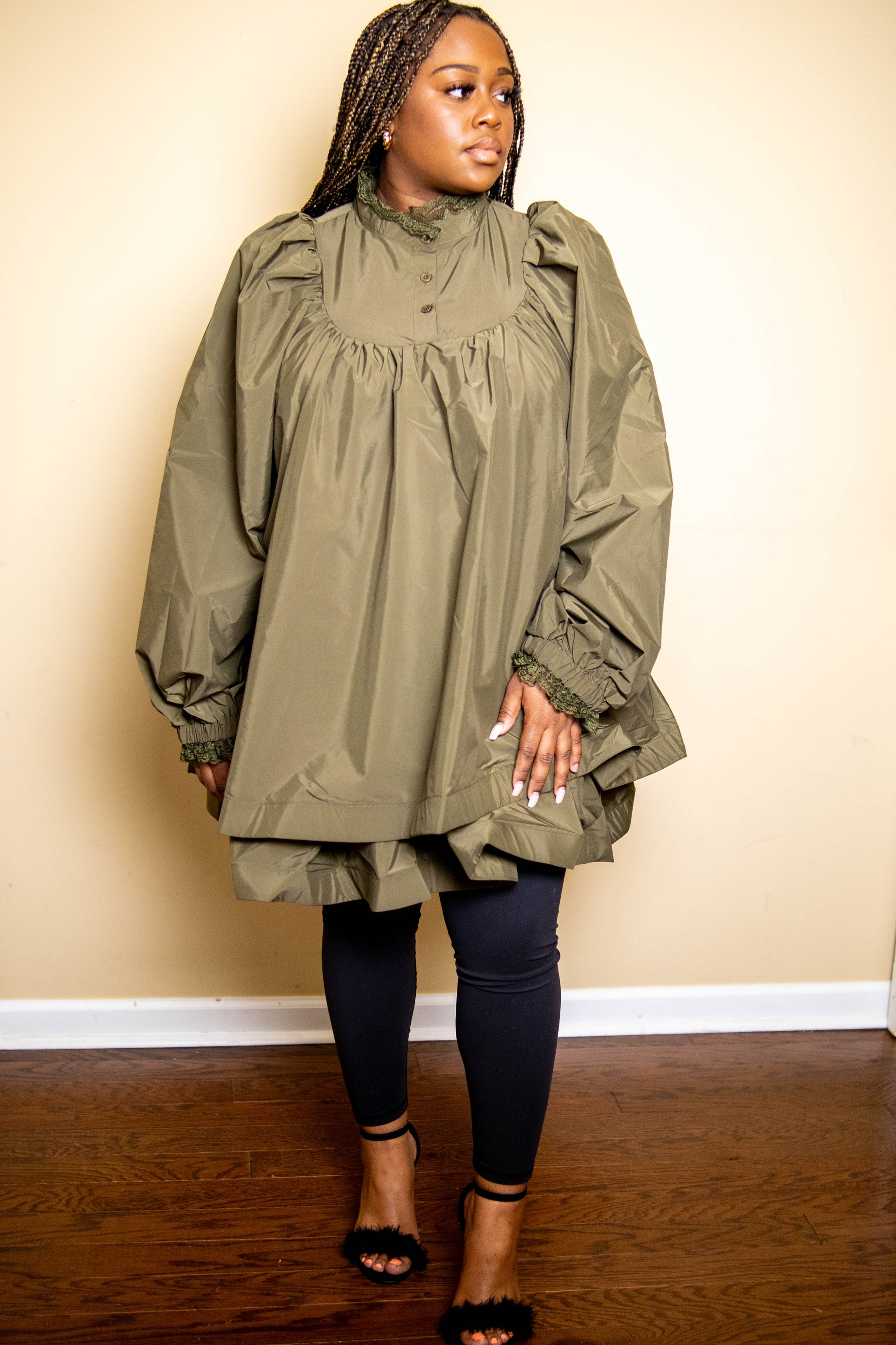 Effortlessly elegant and beautifully versatile, this olive smock dress is designed to flatter while offering all-day comfort. Featuring a high neckline with soft gathered detailing, voluminous long sleeves, and a relaxed tiered silhouette, this piece creates graceful movement with every step. The lightweight fabric drapes beautifully, making it perfect for layering or wearing on its own. Style it with leggings and heels for an elevated look or dress it down with flats for effortless everyday wear.